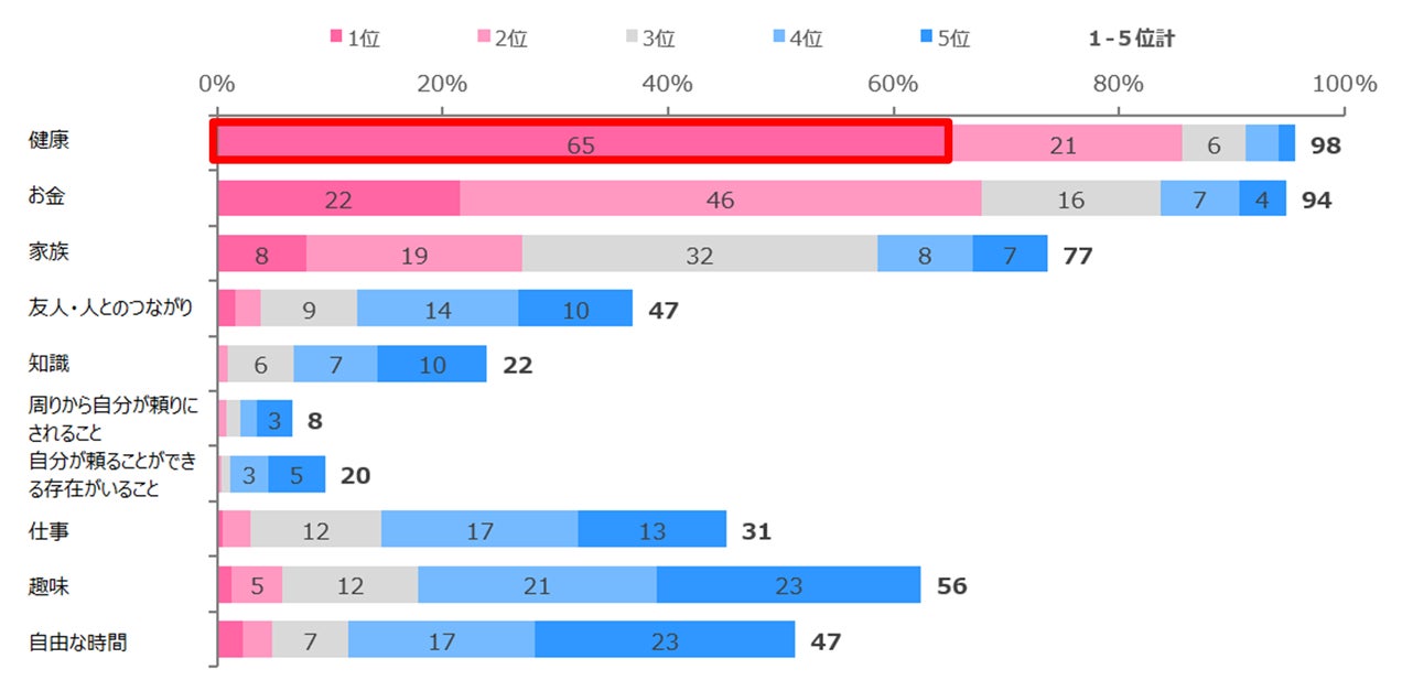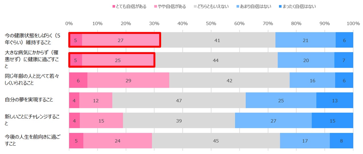 今後の人生を楽しむために重要なものを聞いたところ、上位5つにあげた項目のうち、「健康」が65%で第1位となりました。しかし、今後のご自身の健康に対する自信について聞いたところ、「今の健康状態をしばらく(5年くらい)維持すること」は32%、「大きな病気にかからずに(罹患せずに)健康に過ごすこと」は30%にとどまっており、健康を重視してはいるものの、健康に対する見通しに不安感をもっており、人生後半戦をより充実させるためにも、健康に対する意識変容が必要とされていることが分かりました。
