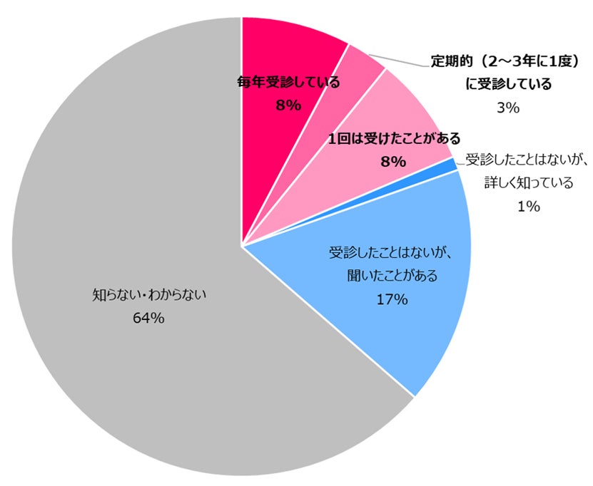 50歳代男性のPSA検査の認知・受診状況は、「毎年受診している(8%)」、「定期的(2~3年に1度)に受診している(3%)」、「1回は受けたことがある(8%)」となり、1回以上の受診は19%となりました。一方で、「知らない・わからない」が64%を占めました(別添資料:P.12参照)。