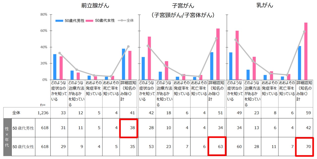 50歳代女性の女性特有がんの症状や治療方法などの詳細に関する認知は、「乳がん(70%)」「子宮がん(63%)」であるのに対し、50歳代男性の「前立腺がん」の詳細に関する認知は38%となりました(別添資料:P.15参照)。