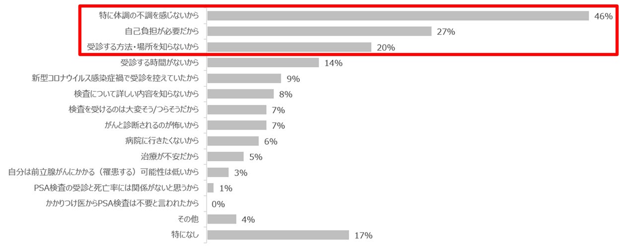 50歳代男性がPSA検査を知っていて受診していない理由TOP3は、「特に体調の不調を感じないから(46%)」、「自己負担が必要だから(27%)」、「受診する方法・場所を知らないから(20%)」でした(別添資料:P.14参照)。