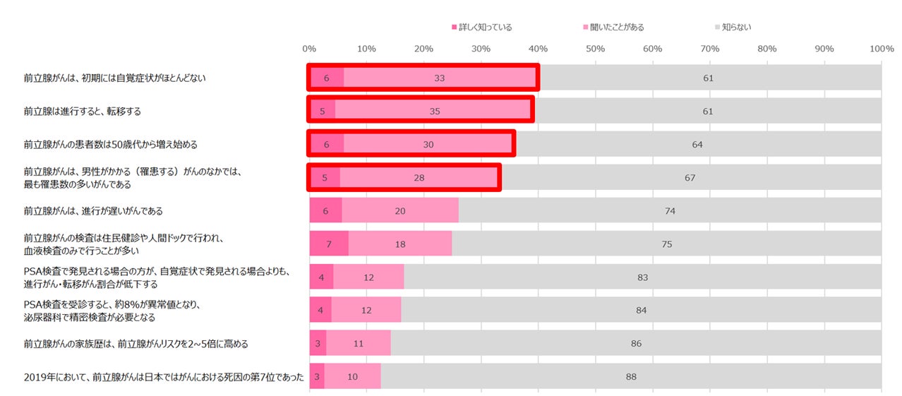 50歳代男性の前立腺がんに関する認知TOP3は、「前立腺がんは、初期には自覚症状がほとんどない(40%)」、「前立腺がんは進行すると、転移する(39%)」、「前立腺がんの患者数は50歳代から増え始める(36%)」で、「前立腺がんは男性が一番罹患しやすいがんである」ことを認知している方は33%にとどまりました(別添資料:P.11参照)。