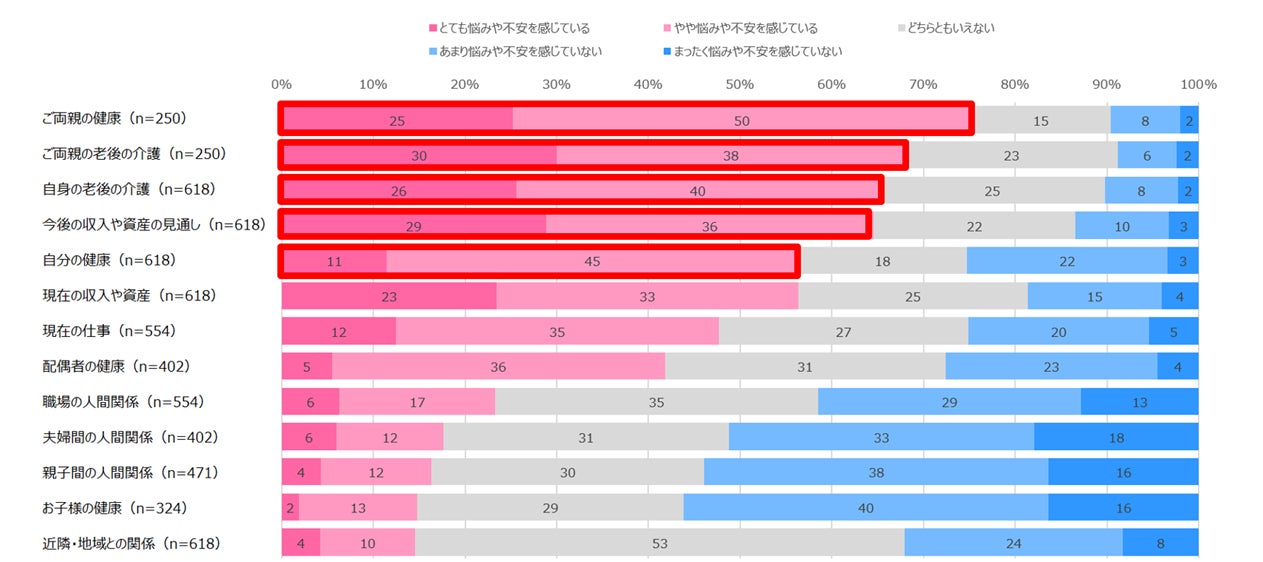 50歳代男性の悩みや不安が高いのは、「ご両親の健康(75%)」、「ご両親の老後の介護(68%)」、「自身の老後の介護(65%)」「今後の収入や資産の見通し(65%)」であり、「自分の健康(56%)」が低い結果となりました(別添資料:P.4参照)。