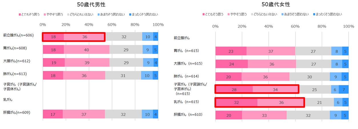 50歳代女性の女性特有がんの発見のための早期検診意向は、「乳がん(68%)」、「子宮がん(62%)」、50歳代男性の「前立腺がん」に対する早期検診意向は55%にとどまりました(別添資料:P.17参照)。
