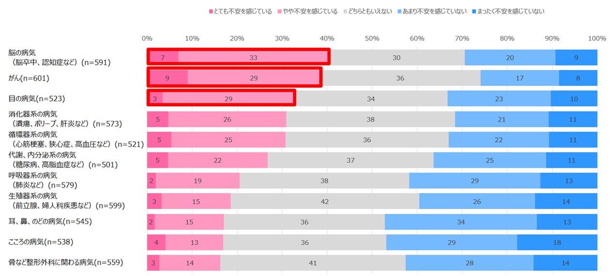 Q:あなたは、以下の病気・症状について、ご自身が将来的にかかる(罹患する)「不安」をどの程度、感じていますか。(各単一回答)