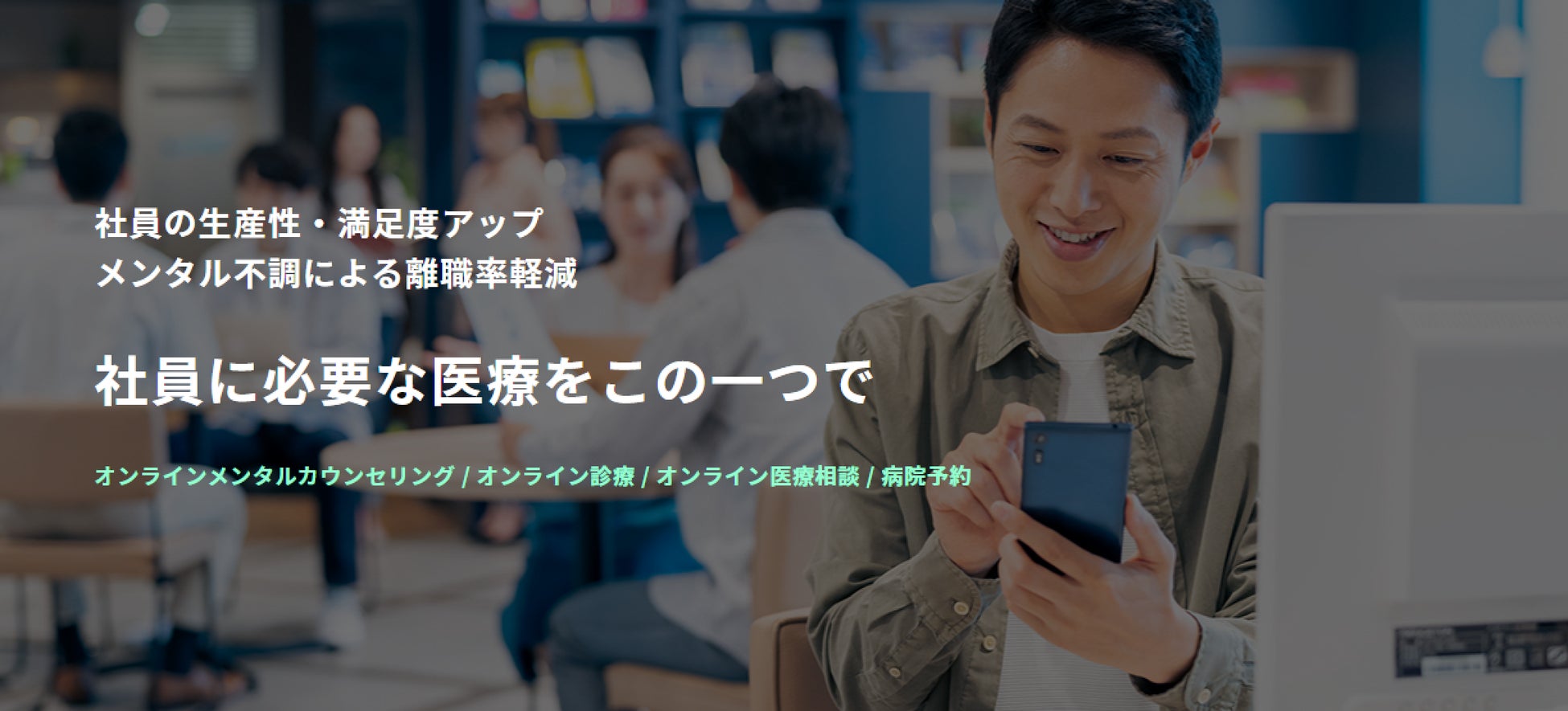 導入企業の従業員はオンラインでのメンタルカウンセリングや医療相談、オンライン診療などが利用できます。全てのサービスがオンラインで利用できるため、場所や時間を選ばず、在宅勤務や遠隔地勤務の従業員も利用できます。