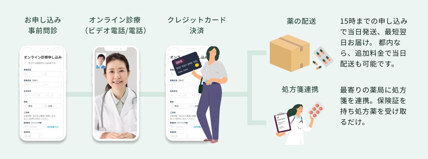 サービスを通じて、24時間・365日オンライン診療対応可能なクリニックを紹介。通院の手間や待ち時間の悩みを解決します。診療後は処方箋または処方薬を郵送します。最短で当日に処方薬を受け取ることも可能です。