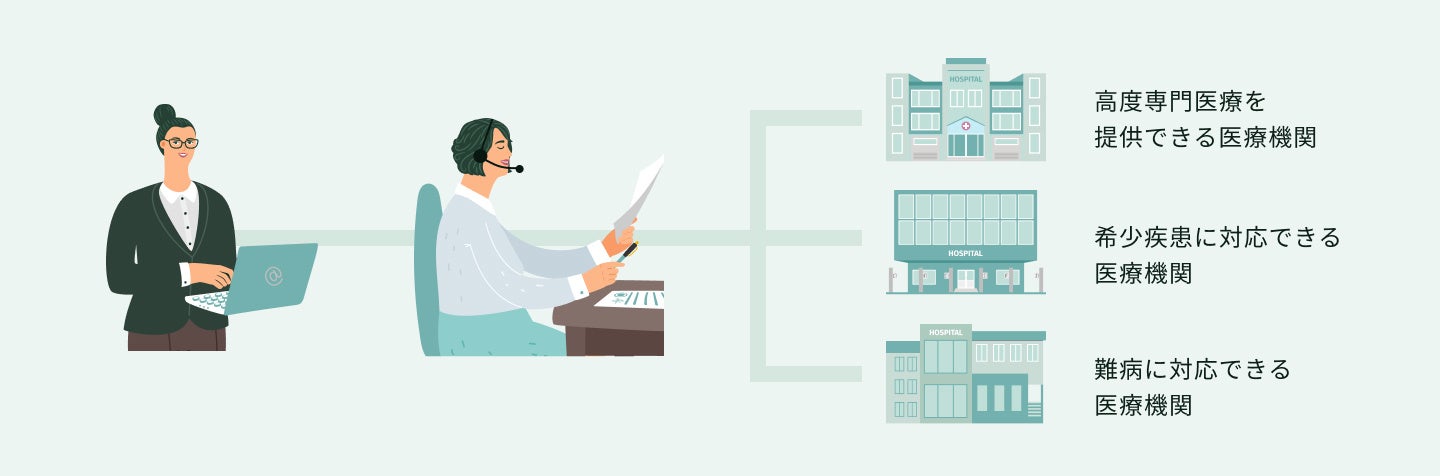 社員やその家族が大きな病気や難病にかかったとき病院の予約を代行します。日本全国のがん診療連携拠点病院や特定機能病院などを含めた130を超える病院への予約が可能です。