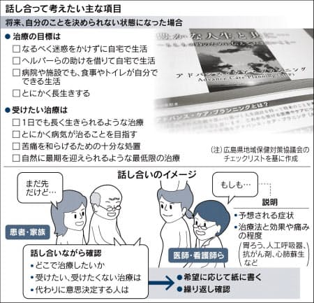 なんぶ内科医院(同県東広島市)は70~90代の約10人とリストに沿って将来の治療方針を話し合った。結果はカルテと一緒に保管している。別の病院に入院する際にも引き継ぎ、本人の希望を伝える手段となった。楠部滋院長は「意向を改めて確認するきっかけになった」と評価する。